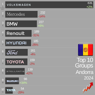 La riqueza de Andorra se refleja en su mercado automovilístico. Las ventas de vehículos comerciales ligeros y de turismos ascendieron a 2.379 unidades en 2024, lo que lo convierte en uno de los mercados más pequeños de Europa. El total disminuyó un 7% con respecto a 2023. El coche más vendido en 2024 fue el Porsche 911. Porsche, ¡la segunda marca más popular, solo por detrás de Mercedes!